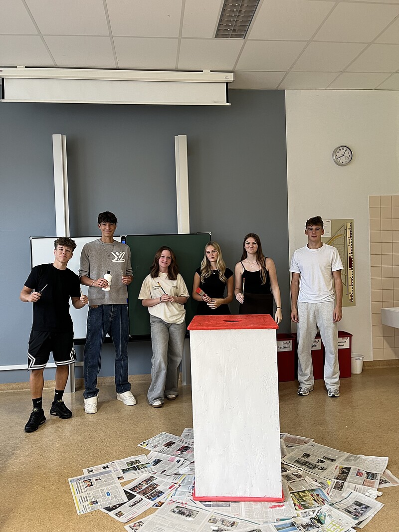 Zweites ein Pfandsammler, der nach eigenen Plänen entwickelt und gebaut wurde. Dieser Pfandsammler befindet sich in der Aula und wird künftig möglichst viele Plastikflaschen in sich aufnehmen.