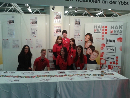 | Vom 16. - 18. Oktober 2012repräsentierten die Schüler der 4. Klasse HAK und 3. Klasse HAS die HAK/HAS Waidhofen/Ybbs bei der Job-Mania in Wieselburg. Sie informierten zahlreiche Schülergruppen mithilfe der mitgebrachten Flyer und Informationsunterlagen. Dadurch wurde den neugierigen Jugendlichen ein Eindruck in die höhere kaufmännische Schule vermittelt. Stolz waren die Schüler auch auf das Gewinnspiel - Skitag auf der Forsteralm mit dem TZW! |