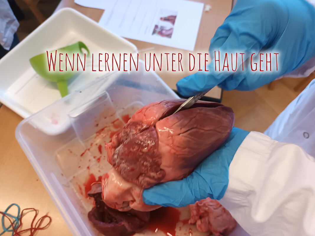 Im NAWI-Unterricht werden alle Schüler*innen mit Schutzkleidung, Skalpell und einem klaren Auftrag ausgestattet. Prof. Piek zeigt vor wies geht und anschließend beschriften die Lernende selbst Herzklappe, Herzkammern und alle anderen entdeckten Teile des Herzens.